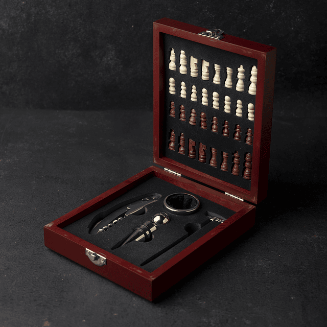 En su interior, encontrarás un juego completo de piezas de ajedrez elaboradas con precisión, que le añaden un toque de sofisticación a cada movimiento. Además, esta maleta incluye accesorios para los amantes del vino, perfecto para disfrutar de tus bebidas favoritas mientras juegas.