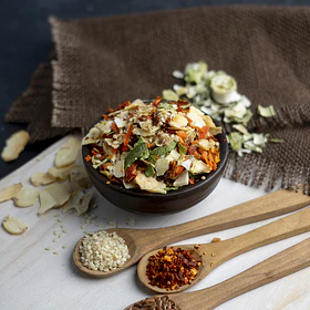 Especia con un toque picante con una mezcla entre sésamo negro, ajo, pimentón rojo de intenso color rojo posee un suave dulzor y rico aroma y ciboulette.