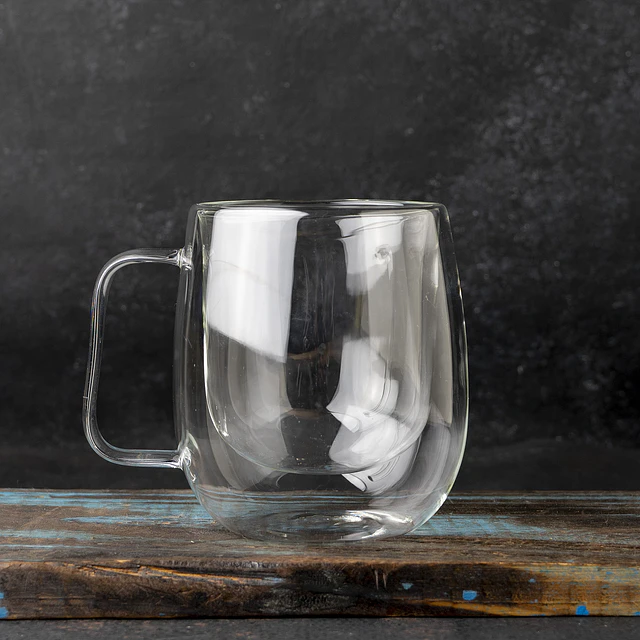 Vaso transparente con doble pared de vidrio con asa. La principal característica es que cuando se usa con bebidas calientes no refracta el calor, por lo que puede tomar el vaso con la mano sin quemarse, en el caso de bebidas frías, el vaso no se humedece por fuera.